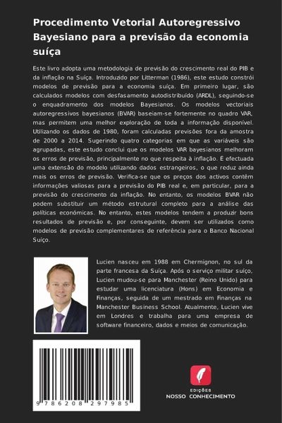 Este livro adopta uma metodologia de previsão do crescimento real do PIB e da inflação na Suíça. Introduzido por Litterman (1986), este estudo constrói modelos de previsão para a economia suíça. Em primeiro lugar, são calculados modelos com desfasamento autodistribuído (ARDL), seguindo-se o enquadramento dos modelos Bayesianos. Os modelos vectoriais autoregressivos bayesianos (BVAR) baseiam-se fortemente no quadro VAR, mas permitem uma melhor exploração de toda a informação disponível. Utilizando os dados de 1980, foram calculadas previsões fora da amostra de 2000 a 2014. Sugerindo quatro categorias em que as variáveis são agrupadas, este estudo conclui que os modelos VAR bayesianos melhoram os erros de previsão, principalmente no que respeita à inflação. É efectuada uma extensão do modelo utilizando dados estrangeiros, o que reduz ainda mais os erros de previsão. Verifica-se que os preços dos activos contêm informações valiosas para a previsão do PIB real e, em particular, para a previsão do crescimento da inflação. No entanto, os modelos BVAR não podem substituir um método estrutural completo para a análise das políticas económicas. No entanto, estes modelos tendem a produzir bons resultados de previsão e, por conseguinte, devem ser utilizados como modelos de previsão complementares de referência para o Banco Nacional Suíço.