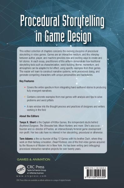This edited collection of chapters concerns the evolving discipline of procedural storytelling in video games. Games are an interactive medium, and this interplay between author, player and machine provides new and exciting ways to create and tell stories. In each essay, practitioners of this artform demonstrate how traditional storytelling tools such as characterization, world-building, theme, momentum and atmosphere can be adapted to full effect, using specific examples from their games. The reader will learn to construct narrative systems, write procedural dialog, and generate compelling characters with unique personalities and backstories.