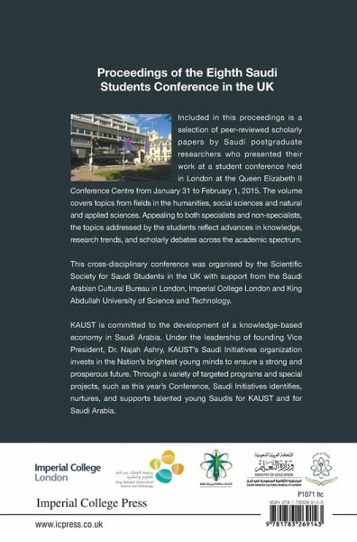 Included in this proceedings is a selection of peer-reviewed scholarly papers by Saudi postgraduate researchers who presented their work at a student conference held in London at the Queen Elizabeth II Conference Centre from January 31 to February 1, 2015. The volume covers topics from fields in the humanities, social sciences and natural and applied sciences. Appealing to both specialists and non-specialists, the topics addressed by the students reflect advances in knowledge, research trends, and scholarly debates across the academic spectrum. This cross-disciplinary conference was organised by the Scientific Society for Saudi Students in the UK with support from the Saudi Arabian Cultural Bureau in London, Imperial College London and King Abdullah University of Science and Technology. KAUST is committed to the development of a knowledge-based economy in Saudi Arabia. Under the leadership of founding Vice President, Dr Najah Ashry, KAUST's Saudi Initiatives organization invests in the Nation's brightest young minds to ensure a strong and prosperous future. Through a variety of targeted programs and special projects, such as this year's Conference, Saudi Initiatives identifies, nurtures, and supports talented young Saudis for KAUST and for Saudi Arabia.