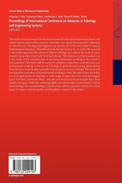 This book contains advanced-level research material in the area of lubrication theory and related aspects, presented by eminent researchers during the International Conference on Advances in Tribology and Engineering Systems (ICATES 2013) held at Gujarat Technological University, Ahmedabad, India during October 15-17, 2013. The material in this book represents the advanced field of tribology and reflects the work of many eminent researchers from both India and abroad. The treatment of the presentations is the result of the contributions of several professionals working in the industry and academia. This book will be useful for students, researchers, academicians, and professionals working in the area of tribology, in general, and bearing performance characteristics, in particular, especially from the point-of-view of design. This book will also appeal to researchers and professionals working in fluid-film lubrication and other practical applications of tribology. A wide range of topics has been included despite space and time constraints. Basic concepts and fundamentals techniques have been emphasized upon, while also including highly specialized topics and methods (such as nanotribology, bio-nanotribology). Care has been taken to generate interest for a wide range of readers, considering the interdisciplinary nature of the subject.