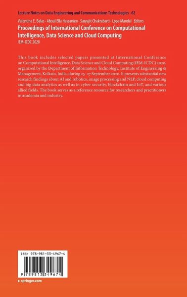 This book includes selected papers presented at International Conference on Computational Intelligence, Data Science and Cloud Computing (IEM-ICDC) 2020, organized by the Department of Information Technology, Institute of Engineering & Management, Kolkata, India, during 25-27 September 2020. It presents substantial new research findings about AI and robotics, image processing and NLP, cloud computing and big data analytics as well as in cyber security, blockchain and IoT, and various allied fields. The book serves as a reference resource for researchers and practitioners in academia and industry. …mehr