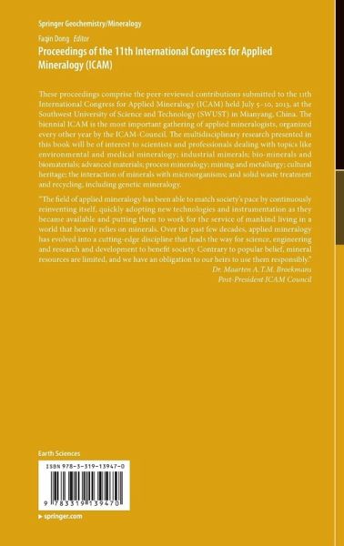 These proceedings comprise the peer-reviewed contributions submitted to the 11th International Congress for Applied Mineralogy (ICAM) held July 5-10, 2013, at the Southwest University of Science and Technology (SWUST) in Mianyang, China. The biennial ICAM is the most important gathering of applied mineralogists, organized every other year by the ICAM-Council. The multidisciplinary research presented in this book will be of interest to scientists and professionals dealing with topics like environmental and medical mineralogy; industrial minerals; bio-minerals and biomaterials; advanced materials; process mineralogy; mining and metallurgy; cultural heritage; the interaction of minerals with microorganisms; and solid waste treatment and recycling, including genetic mineralogy.