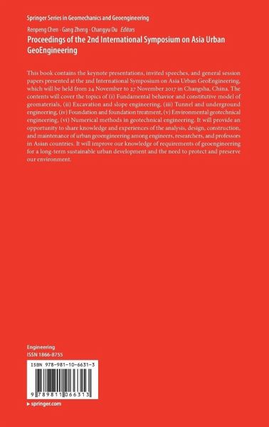 This book contains the keynote presentations, invited speeches, and general session papers presented at the 2nd International Symposium on Asia Urban GeoEngineering, which will be held from 24 November to 27 November 2017 in Changsha, China. The contents will cover the topics of (i) Fundamental behavior and constitutive model of geomaterials, (ii) Excavation and slope engineering, (iii) Tunnel and underground engineering, (iv) Foundation and foundation treatment, (v) Environmental geotechnical engineering, (vi) Numerical methods in geotechnical engineering. It will provide an opportunity to share knowledge and experiences of the analysis, design, construction, and maintenance of urban geoengineering among engineers, researchers, and professors in Asian countries. It will improve our knowledge of requirements of geoengineering for a long-term sustainable urban development and the need to protect and preserve our environment.