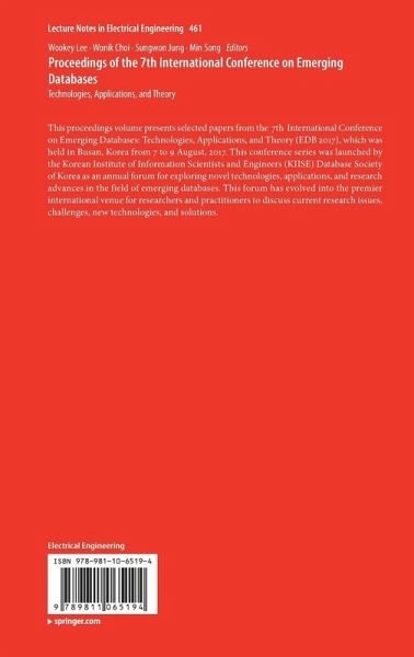 This proceedings volume presents selected papers from the 7th International Conference on Emerging Databases: Technologies, Applications, and Theory (EDB 2017), which was held in Busan, Korea from 7 to 9 August, 2017. This conference series was launched by the Korean Institute of Information Scientists and Engineers (KIISE) Database Society of Korea as an annual forum for exploring novel technologies, applications, and research advances in the field of emerging databases. This forum has evolved into the premier international venue for researchers and practitioners to discuss current research issues, challenges, new technologies, and solutions. …mehr