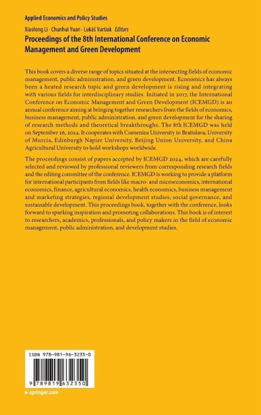 This book covers a diverse range of topics situated at the intersecting fields of economic management, public administration, and green development. Economics has always been a heated research topic and green development is rising and integrating with various fields for interdisciplinary studies. Initiated in 2017, the International Conference on Economic Management and Green Development (ICEMGD) is an annual conference aiming at bringing together researchers from the fields of economics, business management, public administration, and green development for the sharing of research methods and theoretical breakthroughs. The 8th ICEMGD was held on September 26, 2024. It cooperates with Comenius University in Bratislava, University of Murcia, Edinburgh Napier University, Beijing Union University, and China Agricultural University to hold workshops worldwide.