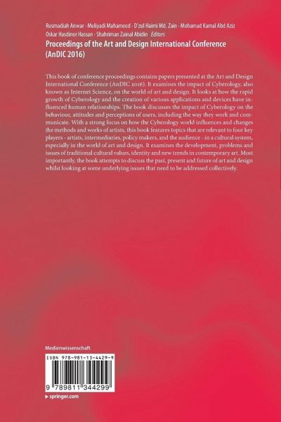This book of conference proceedings contains papers presented at the Art and Design International Conference (AnDIC 2016). It examines the impact of Cyberology, also known as Internet Science, on the world of art and design. It looks at how the rapid growth of Cyberology and the creation of various applications and devices have influenced human relationships. The book discusses the impact of Cyberology on the behaviour, attitudes and perceptions of users, including the way they work and communicate. With a strong focus on how the Cyberology world influences and changes the methods and works of artists, this book features topics that are relevant to four key players - artists, intermediaries, policy makers, and the audience - in a cultural system, especially in the world of art and design. It examines the development, problems and issues of traditional cultural values, identity and new trends in contemporary art. Most importantly, the book attempts to discuss the past, presentand future of art and design whilst looking at some underlying issues that need to be addressed collectively.