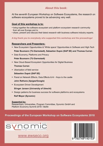 At the seventh European Workshop on Software Ecosystems, the research on software ecosystems and platforms proved to be advancing very well. Goal of this workshop is to:1.bring together the software ecosystem and platform ecosystem research community from all over Europe and2. share, present and discuss their latest research with business software industry experts. Researchers and Presenters:New Ecosystem Opportunities & 'White space' Opportunities in Software and High-Tech Data Economy, Platforms and Privacy Peter Buxmann (TU-Darmstadt)New Cloud-Based Ecosystem Opportunities for Digital Business Thomas CurranUberization of field service Sebastien Dupre (SAP SE)Panel on Network Effects, Data Effects & AI - Keys to the castle John Rethans (Apigee/Google)Ecosystem Driven Development Slinger Jansen (University of Utrecht)Design patterns for business success for software platforms and ecosystems Ralf Meyer (Synomic)