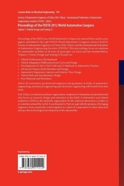 Proceedings of the FISITA 2012 World Automotive Congress are selected from nearly 2,000 papers submitted to the 34th FISITA World Automotive Congress, which is held by Society of Automotive Engineers of China (SAE-China ) and the International Federation of Automotive Engineering Societies (FISITA). This proceedings focus on solutions for sustainable mobility in all areas of passenger car, truck and bus transportation. Volume 7: Vehicle Design and Testing (I) focuses on: