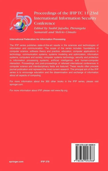 These proceedings contain the papers selected for presentation at the 23rd Inter- tional Information Security Conference (SEC 2008), co-located with IFIP World Computer Congress (WCC 2008), September 8-10, 2008 in Milan, Italy. In - sponse to the call for papers, 143 papers were submitted to the conference. All - pers were evaluated on the basis of their signi?cance, novelty,and technical quality, and reviewed by at least three members of the program committee. Reviewing was blind meaning that the authors were not told which committee members reviewed which papers. The program committee…mehr