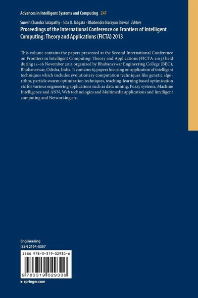 This volume contains the papers presented at the Second International Conference on Frontiers in Intelligent Computing: Theory and Applications (FICTA-2013) held during 14-16 November 2013 organized by Bhubaneswar Engineering College (BEC), Bhubaneswar, Odisha, India. It contains 63 papers focusing on application of intelligent techniques which includes evolutionary computation techniques like genetic algorithm, particle swarm optimization techniques, teaching-learning based optimization etc for various engineering applications such as data mining, Fuzzy systems, Machine Intelligence and ANN, Web technologies and Multimedia applications and Intelligent computing and Networking etc.