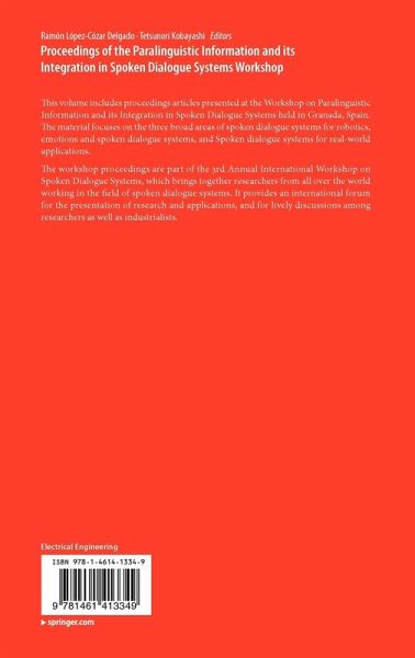 This volume includes proceedings articles presented at the Workshop on Paralinguistic Information and its Integration in Spoken Dialogue Systems held in Granada, Spain. The material focuses on the three broad areas of spoken dialogue systems for robotics, emotions and spoken dialogue systems, and Spoken dialogue systems for real-world applications