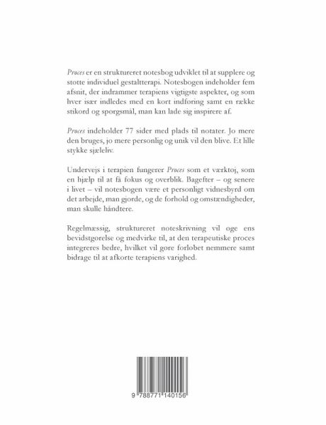 "Proces" er en struktureret notesbog, udviklet til at supplere og støtte individuel gestaltterapi. Notesbogen indeholder fem afsnit, der indrammer terapiens vigtigste aspekter, og som hver især indledes med en kort indføring samt en række stikord og spørgsmål, man kan lade sig inspirere af.