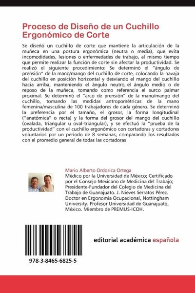 Se diseñó un cuchillo de corte que mantiene la articulación de la muñeca en una postura ergonómica (neutra o media), que evita incomodidades, lesiones o enfermedades de trabajo, al mismo tiempo que permite realizar la función de corte sin afectar la productividad. Se realizó el siguiente procedimiento: Se determinó el ángulo de prensión de la mano/mango del cuchillo de corte, colocando la navaja del cuchillo en posición horizontal y desviando el mango del cuchillo hacia arriba, manteniendo el ángulo neutro, el ángulo medio o de reposo de la muñeca, tomando como referencia el surco palmar proximal. Se determinó el arco de prensión de la mano/mango del cuchillo, tomando las medidas antropométricas de la mano femenina/masculina de 100 trabajadores de cada género. Se determinó la preferencia por el tamaño, el grosor, la forma longitudinal ( anatómica o recta) y la forma del grosor del mango del cuchillo (ovalada, triangular u oval-triangular), y se efectuó la prueba de la productividad con el cuchillo ergonómico con cortadoras y cortadores voluntarios por un período de 8 semanas, comparando los resultados con el promedio general de todas las cortadoras