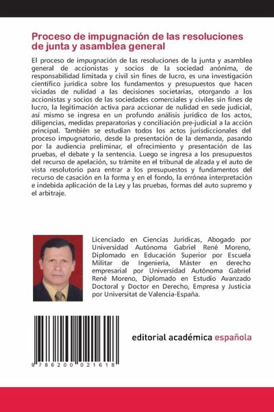 El proceso de impugnación de las resoluciones de la junta y asamblea general de accionistas y socios de la sociedad anónima, de responsabilidad limitada y civil sin fines de lucro, es una investigación científico jurídica sobre los fundamentos y presupuestos que hacen viciadas de nulidad a las decisiones societarias, otorgando a los accionistas y socios de las sociedades comerciales y civiles sin fines de lucro, la legitimación activa para accionar de nulidad en sede judicial, así mismo se ingresa en un profundo análisis jurídico de los actos, diligencias, medidas preparatorias y conciliación pre-judicial a la acción principal. También se estudian todos los actos jurisdiccionales del proceso impugnatorio, desde la presentación de la demanda, pasando por la audiencia preliminar, el ofrecimiento y presentación de las pruebas, el debate y la sentencia. Luego se ingresa a los presupuestos del recurso de apelación, su trámite en el tribunal de alzada y el auto de vista resolutorio para entrar a los presupuestos y fundamentos del recurso de casación en la forma y en el fondo, la errónea interpretación e indebida aplicación de la Ley y las pruebas, formas del auto supremo y el arbitraje.