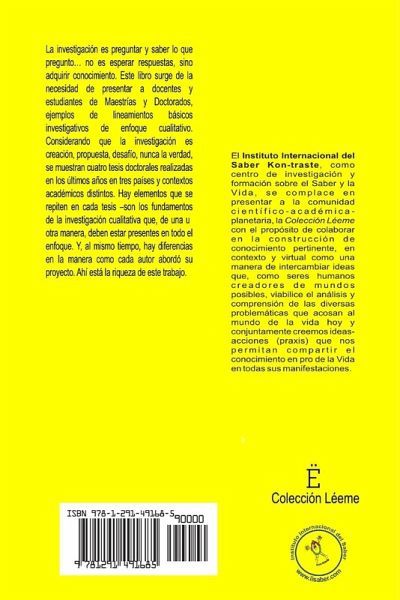 La investigación es preguntar y saber lo que pregunto... no es esperar respuestas, sino adquirir conocimiento. Este libro surge de la necesidad de presentar a docentes y estudiantes de Maestrías y Doctorados, ejemplos de lineamientos básicos investigativos de enfoque cualitativo. Considerando que la investigación es creación, propuesta, desafío, nunca la verdad, se muestran cuatro tesis doctorales realizadas en los últimos años en tres países y contextos académicos distintos. Hay elementos que se repiten en cada tesis -son los fundamentos de la investigación cualitativa que, de una u otra manera, deben estar presentes en todo el enfoque. Y, al mismo tiempo, hay diferencias en la manera como cada autor abordó su proyecto. Ahí está la riqueza de este trabajo.
