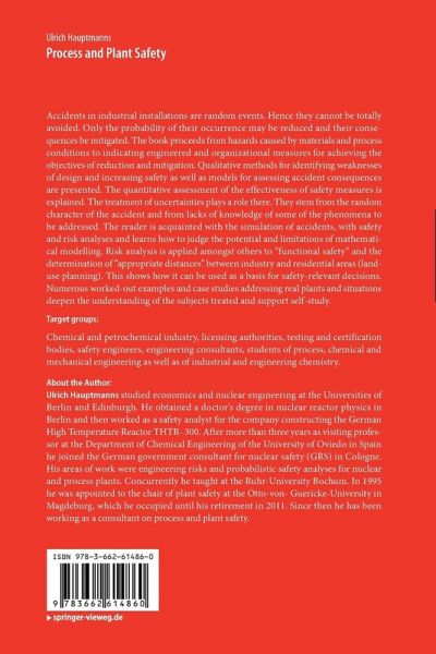 Accidents in industrial installations are random events. Hence they cannot be totally avoided. Only the probability of their occurrence may be reduced and their consequences be mitigated. The book proceeds from hazards caused by materials and process conditions to indicating engineered and organizational measures for achieving the objectives of reduction and mitigation. Qualitative methods for identifying weaknesses of design and increasing safety as well as models for assessing accident consequences are presented. The quantitative assessment of the effectiveness of safety measures is explained. The treatment of uncertainties plays a role there. They stem from the random character of the accident and from lacks of knowledge of some of the phenomena to be addressed. The reader is acquainted with the simulation of accidents, with safety and risk analyses and learns how to judge the potential and limitations of mathematical modelling. Risk analysis is applied amongst others to "functional safety" and the determination of "appropriate distances" between industry and residential areas (land-use planning). This shows how it can be used as a basis for safety-relevant decisions. Numerous worked-out examples and case studies addressing real plants and situations deepen the understanding of the subjects treated and support self-study.