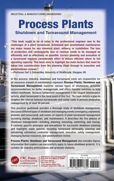 Focus on turnaround management in process industries is to lengthen the interval between turnarounds. This book outlines a strategy to execute optimized shutdown and turnaround by changing plant operating conditions and inspection techniques including managing more favorable turnaround options, planning and scheduling, estimation, contractor management, and execution.