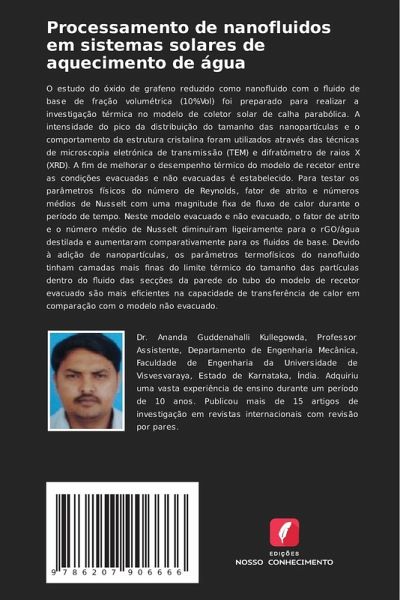 O estudo do óxido de grafeno reduzido como nanofluido com o fluido de base de fração volumétrica (10%Vol) foi preparado para realizar a investigação térmica no modelo de coletor solar de calha parabólica. A intensidade do pico da distribuição do tamanho das nanopartículas e o comportamento da estrutura cristalina foram utilizados através das técnicas de microscopia eletrónica de transmissão (TEM) e difratómetro de raios X (XRD). A fim de melhorar o desempenho térmico do modelo de recetor entre as condições evacuadas e não evacuadas é estabelecido. Para testar os parâmetros físicos do número de Reynolds, fator de atrito e números médios de Nusselt com uma magnitude fixa de fluxo de calor durante o período de tempo. Neste modelo evacuado e não evacuado, o fator de atrito e o número médio de Nusselt diminuíram ligeiramente para o rGO/água destilada e aumentaram comparativamente para os fluidos de base. Devido à adição de nanopartículas, os parâmetros termofísicos do nanofluido tinham camadas mais finas do limite térmico do tamanho das partículas dentro do fluido das secções da parede do tubo do modelo de recetor evacuado são mais eficientes na capacidade de transferência de calor em comparação com o modelo não evacuado.