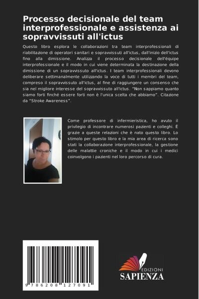 Questo libro esplora le collaborazioni tra team interprofessionali di riabilitazione di operatori sanitari e sopravvissuti all'ictus, dall'inizio dell'ictus fino alla dimissione. Analizza il processo decisionale dell'équipe interprofessionale e il modo in cui viene determinata la destinazione della dimissione di un sopravvissuto all'ictus. I team interprofessionali devono deliberare settimanalmente utilizzando la voce di tutti i membri del team, compreso il sopravvissuto all'ictus, al fine di raggiungere un consenso che sia nel migliore interesse del sopravvissuto all'ictus. ¿Non sappiamo quanto siamo forti finché essere forti non è l'unica scelta che abbiamö. Citazione da ¿Stroke Awareness¿.