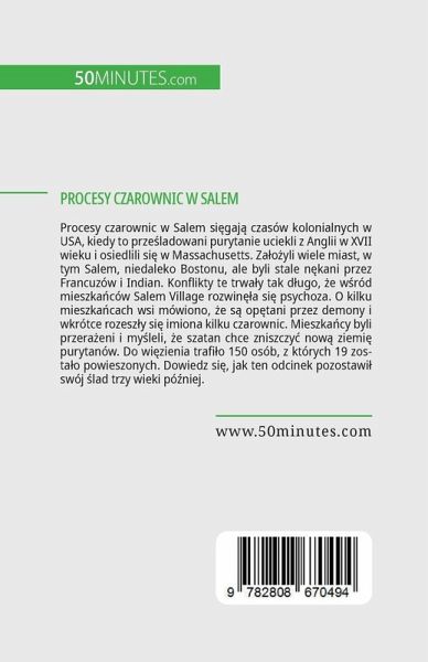 Procesy czarownic w Salem si¿gaj¿ czasów kolonialnych w USA, kiedy to prze¿ladowani purytanie uciekli z Anglii w XVII wieku i osiedlili si¿ w Massachusetts. Zäo¿yli wiele miast, w tym Salem, niedaleko Bostonu, ale byli stale n¿kani przez Francuzów i Indian. Konflikty te trwäy tak d¿ugo, ¿e w¿ród mieszkäców Salem Village rozwin¿¿a si¿ psychoza. O kilku mieszkäcach wsi mówiono, ¿e s¿ op¿tani przez demony i wkrótce rozesz¿y si¿ imiona kilku czarownic. Mieszkäcy byli przeräeni i my¿leli, ¿e szatan chce zniszczy¿ now¿ ziemi¿ purytanów. Do wi¿zienia trafi¿o 150 osób, z których 19 zostäo powieszonych. Dowiedz si¿, jak ten odcinek pozostawi¿ swój ¿lad trzy wieki pó¿niej.