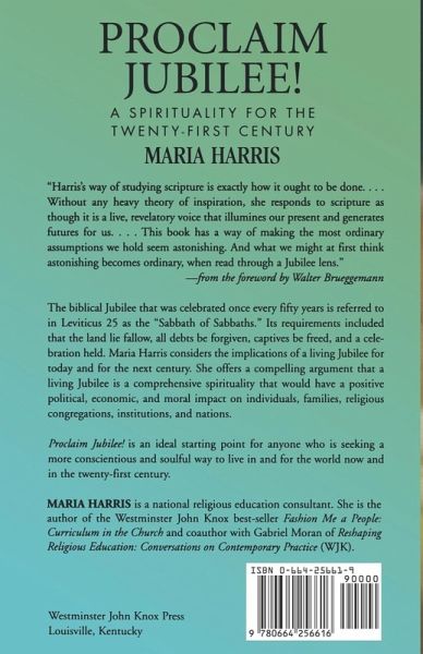 The biblical Jubilee that was celebrated once every fifty years is referred to in Leviticus 25 as the "Sabbath of Sabbaths". Its requirements included that the land lie fallow, all debts be forgiven, captives be freed, and a celebration held. Maria Harris considers the implications of a living Jubilee for today and for the next century. She offers a compelling argument that a living Jubilee is a comprehensive spirituality that would have a positive political, economic, and moral impact on individuals, families, religious congregations, institutions, and nations.