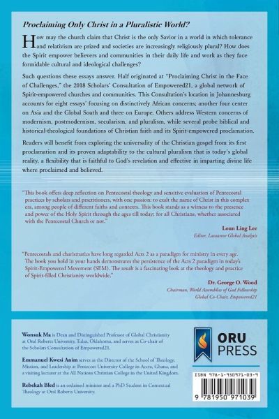How may the church claim that Christ is the only Savior in a world in which tolerance and relativism are prized and societies are increasingly religiously plural? How does the Spirit empower believers and communities in their daily life and work as they face formidable cultural and ideological challenges? Such questions these essays answer. Half originated at "Proclaiming Christ in the Face of Challenges," the 2018 Scholars¿ Consultation of Empowered21, a global network of Spirit-empowered churches and communities. This Consultation¿s location in Johannesburg accounts for eight essays¿ focusing on distinctively African concerns; another four center on Asia and the Global South and three on Europe. Others address Western concerns of modernism, postmodernism, secularism, and pluralism, while several probe biblical and historical-theological foundations of Christian faith and its Spirit-empowered proclamation. Readers will benefit from exploring the universality of the Christian gospel from its fi rst proclamation and its proven adaptability to the cultural pluralism that is today¿s global reality, a flexibility that is faithful to God¿s revelation and effective in imparting divine life where proclaimed and believed.