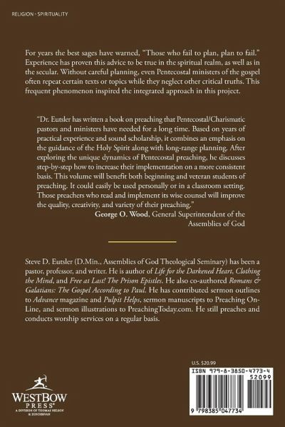 For years the best sages have warned, "Those who fail to plan, plan to fail." Experience has proven this advice to be true in the spiritual realm, as well as in the secular. Without careful planning, even Pentecostal ministers of the gospel often repeat certain texts or topics while they neglect other critical truths. This frequent phenomenon inspired the integrated approach in this project. "Dr. Eutsler has written a book on preaching that Pentecostal/Charismatic pastors and ministers have needed for a long time. Based on years of practical experience and sound scholarship, it combines an emphasis on the guidance of the Holy Spirit along with long-range planning. After exploring the unique dynamics of Pentecostal preaching, he discusses step-by-step how to increase their implementation on a more consistent basis. This volume will benefit both beginning and veteran students of preaching. It could easily be used personally or in a classroom setting. Those preachers who read and implement its wise counsel will improve the quality, creativity, and variety of their preaching." George O. Wood, General Superintendent of the Assemblies of God