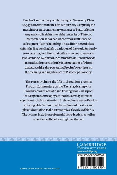 Proclus' commentary on Plato's dialogue Timaeus is arguably the most important commentary on a text of Plato, offering unparalleled insights into eight centuries of Platonic interpretation. It has had an enormous influence on subsequent Plato scholarship. This edition offers the first new English translation of the work for nearly two centuries, building on significant recent advances in scholarship on Neoplatonic commentators. It provides an invaluable record of early interpretations of Plato's dialogue, while also presenting Proclus' own views on the meaning and significance of Platonic philosophy. The present volume, the fifth in the edition, presents Proclus' commentary on the Timaeus, dealing with Proclus' account of static and flowing time; we see Proclus situating Plato's account of the motions of the stars and planets in relation to the astronomical theories of his day. The volume includes a substantial introduction, as well as notes that will shed new light on the text.