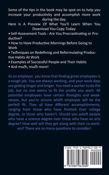 Some of the tips in the book may be spot on to help you increase your productivity and accomplish more work during the day.Here Is A Preview Of What You'll Learn When You Download You Copy Today:Self-Assessment Tools - Are You Procrastinating or Productive?How to Have Productive Mornings Before Going to WorkTechniques on Redefining and Reformulating Productive Habits At WorkExamples of Successful People and Their HabitsAnd much, much more! As an employer, you know that finding great employees is a tough job. You are always working, and your work days are getting longer and longer. You need a worker to do the job, but no one seems to fit the profile you want. All potential employees have certain strengths and weaknesses, but you're unsure which employee will be the perfect fit. They all have different accomplishments, ranging from those who have finished their college degree, to those who haven't. Should you select people who have a science degree over those who have an arts degree? How well will they get along with their co-workers? There are so many questions to consider!