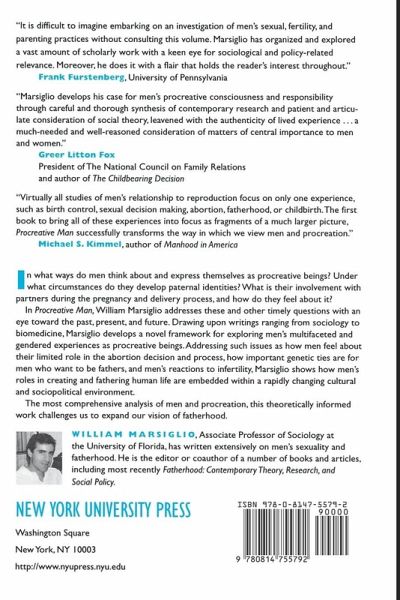 In what ways do men think about and express themselves as procreative beings? Under what circumstances do they develop paternal identities? What is their involvement with partners during the pregnancy and delivery process, and how do they feel about it? In Procreative Man, William Marsiglio addresses these and other timely questions with an eye toward the past, present, and future. Drawing upon writings ranging from sociology to biomedicine, Marsiglio develops a novel framework for exploring men's multifaceted and gendered experiences as procreative beings. Addressing such issues as how men feel about their limited role in the abortion decision and process, how important genetic ties are for men who want to be fathers, and men's reactions to infertility, Marsiglio shows how men's roles in creating and fathering human life is embedded within a rapidly changing cultural and sociopolitical environment. The most comprehensive analysis of men and procreation, this theoretically informed work challenges us to expand our vision of fatherhood.