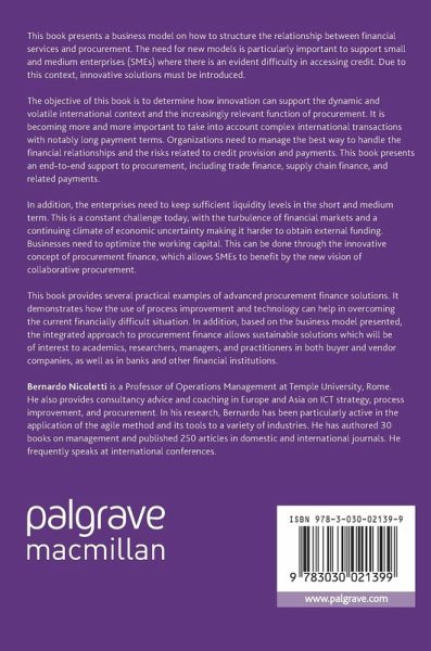 The objective of this book is to determine how innovation can support the dynamic and volatile international context and the increasingly relevant function of procurement. It is becoming more and more important to take into account complex international transactions with notably long payment terms. Organizations need to manage the best way to handle the financial relationships and the risks related to credit provision and payments. This book presents an end-to-end support to procurement, including trade finance, supply chain finance, and related payments.