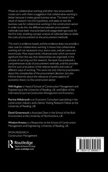 Do recent moves in the construction industry towards collaborative working and other new procurement procedures really make good business sense? Procurement in the Construction Industry is the result of research into this question and it includes the first rigorous categorizing of the differences between procurement methods currently in use. In the process of carrying out this research, the team has produced a comprehensive study of procurement methods which looks in detail at the relative benefits and costs of different ways of working, with sometimes surprising results. As such, it is not only a valuable guide for practitioners on the complexities of the procurement process, but also an outline of the relevance of economic theory to the construction sector.