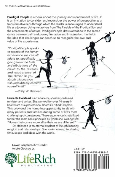 Prodigal People is a book about the journey and wonderment of life. It is an invitation to consider and reconsider the power of perspective as a transformative lens through which the reader is encouraged to understand life as a journey. Using metaphors from The Parable of the Prodigal Son and the amazements of nature, Prodigal People draws attention to the sacred dance between pain and power, limitation and imagination. It unfolds the idea that challenges can teach us to recognize the awe and value of life experiences.