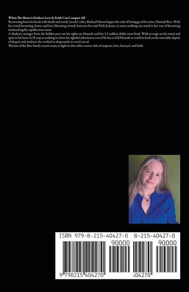 When The Hour is Darkest Love & Faith Can Conquer All Recovering from his brush with death and newly (nearly) sober, Richard Mason begins the task of letting go of his sister, Hannah Rice. With her mind becoming clearer and love blooming sweetly between her and Nick Jackson, it seems nothing can stand in her way of becoming declared legally capable once more. A shadowy stranger from the hidden past sets his sights on Hannah and her 3.5 million dollar trust fund. With revenge on his mind and spite in his heart, he'll stop at nothing to claim his rightful inheritance even if he has to kill Hannah or send her back to the miserable depths of despair and madness she worked so desperately to crawl out of. The last of the Rice family secrets come to light in this roller coaster ride of suspense, love, betrayal, and faith.