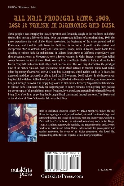 Three people's lives interplay for love, for protest, and for family. Caught in the conflicted end of the Sixties, they pursue a life worth living. David Morpheys comes to Wells College to study enough French to live in Canada and meets Kady Bontecott off to a semester in France. That month they fall in love separated till summer in Paris. Kurt Kallini looks after Kady for her father's sake. Father and son connect through Bontecott Stone and the import of diamonds and dust. Kallini stands at the center that won't hold in the radical movement. At Cornell, the Movement takes over the university. Then in protest of an expanded war, five hundred colleges shut down and 100,000 protesters march on Washington in the culmination and last gasp of student protest. Over the course and fullness of a prodigal time, 1969, the three experience the end of the Sixties revolution, the beginning of the underground and GI Resistance, and travel in exile from the draft and its inclusion of youth in the distant and ever-present War in Vietnam. Kady and David travel Europe, work in France, come home for a wedding in Hudson Park, NY and a funeral in Dalhart, Texas, travel to California where Kady's sure she's pregnant, return to Woodstock, work a Freres' vacation in Vichy, France, where Kurt Kallini comes between the two of them. Now Kurt knows he's his father's bastard son and Bontecott refuses him the business. In spite, Kallini advises Kady to have her abortion. Ultimately Kurt Kallini prepares to bring into the states the motherload of diamonds and dust, to bankrupt and buy out his father's business of Bontecott Stones and fund the GI Resistance Movement. David returns from a walled-in Berlin to Kady working for Les Freres. They tell each other truths they can't bear to hear. The love they shared like the prodigal time of the Sixties runs out. Kady goes home to take care of her mom, while David retreats to Munich to write his college thesis. There Kurt Kallini offers big money if David
