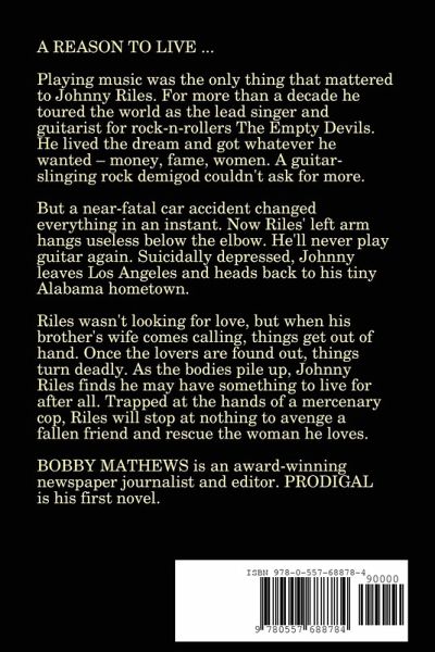 Susan. Monica. Teresa. Wendy. Thalia. Farrah. Shannon -- how Johnny Riles used to mark the days of the week. Johnny had fame, money and all the women he could want. But a car accident stripped him of the use of his left arm and marred his good looks. Alone and devoid of his livelihood (guitar-slinging rock star), Johnny can't stay in L.A. A return to small-town Alabama, and suddenly the days are all the same: Sarah. Bad news is, Sarah is married to a hometown football hero-turned cop -- who happens to be Johnny's little brother, Aaron. Johnny's reappearance and affair with Sarah rekindles a sibling rivalry that soon turns deadly. But when Aaron finds out Sarah is pregnant, the situation spins out of control, leaving Johnny and Sarah fighting for their lives. Prodigal is a thriller with a southern flair, a book that examines the breaking point between family, lovers and friends.
