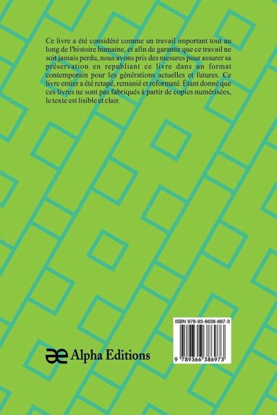 Prodige du cur" est un livre classique, qui a eu une valeur significative tout au long de l'histoire, et pour garantir que sa sagesse intemporelle ne soit jamais perdue, Alpha Editions l'a soigneusement préservé en le republiant dans un format moderne et accessible aux générations présentes et futures. Soigneusement reformaté, retapé , et nouvellement conçue, cette édition offre un texte clair et lisible, sans copies numérisées de l'uvre originale, Alpha Editions se consacre à insuffler une nouvelle vie aux livres anciens et classiques, rendant ces trésors littéraires à nouveau disponibles pour les lecteurs qui chérissent l'histoire. culture et savoir intemporel.