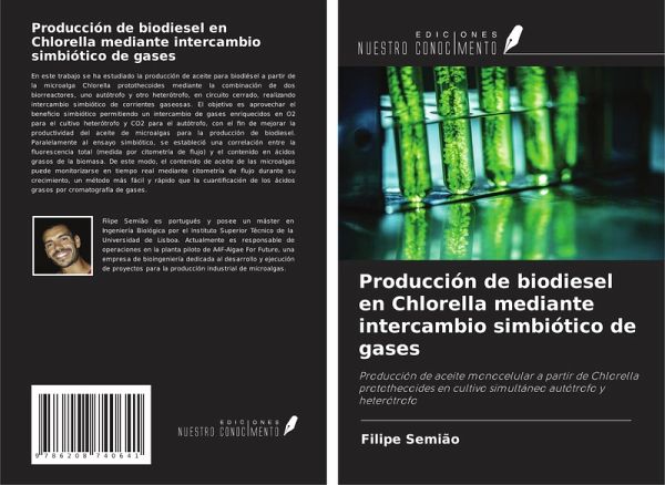 En este trabajo se ha estudiado la producción de aceite para biodiésel a partir de la microalga Chlorella protothecoides mediante la combinación de dos biorreactores, uno autótrofo y otro heterótrofo, en circuito cerrado, realizando intercambio simbiótico de corrientes gaseosas. El objetivo es aprovechar el beneficio simbiótico permitiendo un intercambio de gases enriquecidos en O2 para el cultivo heterótrofo y CO2 para el autótrofo, con el fin de mejorar la productividad del aceite de microalgas para la producción de biodiesel. Paralelamente al ensayo simbiótico, se estableció una correlación entre la fluorescencia total (medida por citometría de flujo) y el contenido en ácidos grasos de la biomasa. De este modo, el contenido de aceite de las microalgas puede monitorizarse en tiempo real mediante citometría de flujo durante su crecimiento, un método más fácil y rápido que la cuantificación de los ácidos grasos por cromatografía de gases.