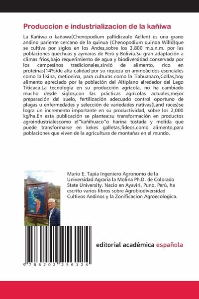 La Kañiwa o kañawa(Chenopodium pallidicaule Aellen) es una grano andino pariente cercano de la quinua (Chenopodium quinoa Willd)que se cultiva por siglos en los Andes,sobre los 3,800 m.s.n.m. por las poblaciones quechuas y aymaras de Perú y Bolivia.Su gran adaptación a climas fríos,bajo requerimiento de agua y biodiversidad conservada por los campesinos tradicionales,sirvió de alimento, rico en proteínas(14%)de alta calidad por su riqueza en aminoácidos esenciales como la lisina, metionina, para culturas como la Tiahuanaco,Collas,hoy alimento apreciado por la población del Altiplano alrededor del Lago Titicaca.La tecnología en su producción agrícola, no ha cambiado mucho desde siglos,con las prácticas agrícolas actuales,mejor preparación del suelo, fertilización adecuado control oportuno de plagas u enfermedades y selección de variedades nativas(Land races)se logra un incremento importante en su productividad, sobre los 2,000 kg/ha.En esta publicación se plantea:su transformaciónen productos agroindustrialescomo el"kañihuaco"o harina tostada y molida que puede transformarse en kekes galletas,fideos,como alimento,para poblaciones que viven de la agricultura de montañas en el mundo.