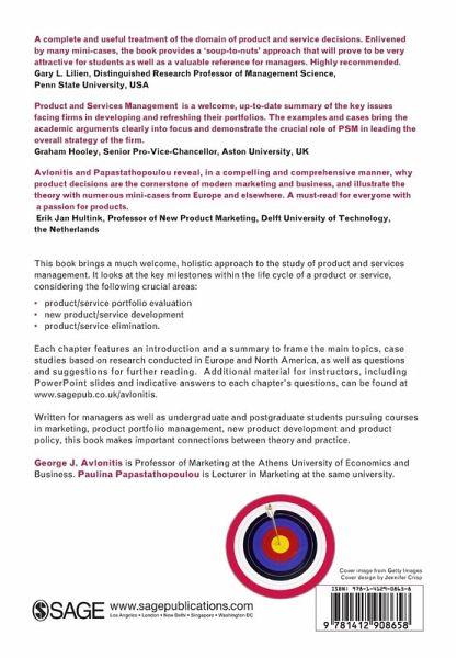 `A text that successfully bridges the gap between academic theorizing and practitioner applicability because it uses multiple real-world examples/mini-cases of management techniques to illustrate the well-researched academic theoretical foundations of the book' - Creativity and Innovation Management `A complete and useful treatment of the domain of product and service decisions. This book is unique in its treatment, dealing with product and service portfolio evaluation, new product/service development and product/service elimination in an integrated manner. Enlivened by many mini-cases, the book provides a soup-to-nuts approach that will prove very attractive for students and be a valuable reference for managers as well. Highly recommended' - Gary L Lilien, Distinguished Research Professor of Management Science, Penn State University `Product and Services Management (PSM) is a welcome, up to date summary of the key issues facing firms in developing and refreshing their portfolios. The examples and cases bring the academic arguments clearly into focus and demonstrate the crucial role of PSM in leading the overall strategy of the firm' - Professor Graham Hooley, Senior Pro-Vice-Chancellor, Aston University, Birmingham `Managers responsible for and students interested in product portfolio decisions previously had to consult several sources for obtaining up-to-date information; books on new product development, articles on service development, readers on product management, and frameworks for product evaluation and termination. With the book Product and Services Management the reader obtains four-in-one. Avlonitis and Papastathopoulou reveal in a compelling and comprehensive manner why product decisions are the cornerstone of modern marketing and business, and illustrate the theory with numerous mini-cases from Europe and elsewhere. A must read for everyone with a passion for products' - Dr Erik Jan Hultink, Professor of New Product Marketing, Delft University of Technology This book provides a holistic approach to the study of product and services management. It looks at the key milestones within a product's or service life cycle and considers in detail three crucial areas within product management, namely product/service portfolio evaluation, new product/service development and product/service elimination. Based on research conducted in Europe and North America, this book includes revealing cases studies that will help students make important connections between theory and practice. The pedagogical features provided in each chapter include chapter introduction, summary, questions and a further reading section. Additional material for instructors include PowerPoint slides and indicative answers to each chapter's questions. This book is written for undergraduate and postgraduate students of business administration who are pursuing courses in marketing, product portfolio management, new product development and product policy.