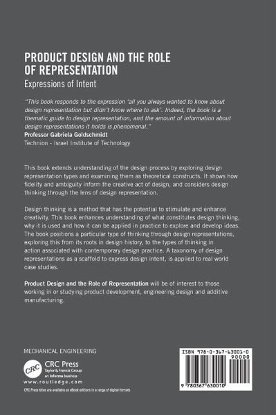 "This book responds to the expression 'all you always wanted to know about design representation but didn't know where to ask'. Indeed, the book is a thematic guide to design representation, and the amount of information about design representations it holds is phenomenal." Professor Gabriela Goldschmidt Technion - Israel Institute of Technology This book extends understanding of the design process by exploring design representation types and examining them as theoretical constructs. It shows how fidelity and ambiguity inform the creative act of design, and considers design thinking through the lens of design representation. Design thinking is a method that has the potential to stimulate and enhance creativity. This book enhances understanding of what constitutes design thinking, why it is used and¿how it can be applied in practice to explore and develop ideas. The book positions a particular type of thinking through design¿representations, exploring this from its roots in design¿history, to the types of thinking in action associated with contemporary¿design practice. A taxonomy of design representations as a scaffold to express design intent, is applied to real world case studies. Product Design and the Role of Representation will be of interest to those working in or studying product development, engineering design and additive manufacturing.