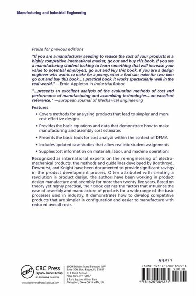 Suitable for use in product design and design for manufacture courses, this book includes case studies of the application of design for manufacture and assembly (DFMA) techniques, important industry changes, and emphasis on trends such as design for power injection molding and surface mount devices.