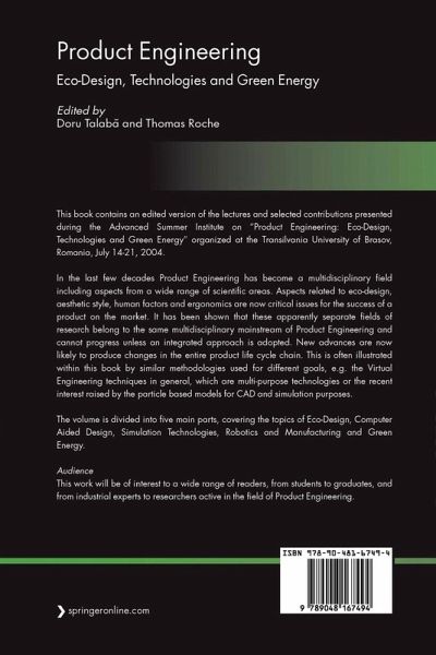This book contains an edited version of the lectures and selected contributions presented during the Advanced Summer Institute on "Product Engineering: Eco-Design, Technologies and Green Energy" organized at the st Transilvania University of Brasov (Romania) in the period 14-21 of July 2004. The Advanced Summer Institute (ASI) was organized in the framework of the European FP5 funded project "ADEPT - Advanced computer aided Design of Ecological Products and Technologies integrating green energy sources" and was devoted to the Product Engineering field, with particular attention to the aspects related to the environmentally conscious design and green energy sources. The objective of the ASI was to create the framework for meeting of leading scientists with PhD holders and advanced PhD students carrying out research in the field of Eco-Design, CAD, Simulation technologies, Robotics, Manufacturing and green energy sources. The aim was to create conditions for high level training through a series of 15 invited lectures presented by world reputed scientists, as well as to give possibilities for young researchers to present their achievements and to establish professional contacts. The ASI was seen also as an opportunity for academics, practitioners and consultants from Europe and elsewhere who are involved in the study, management, development and implementation of product engineering principles in the learning and teaching sectors, as well as professionals to come together and share ideas on projects and examples of best practice.