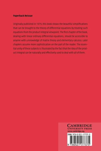 Originally published in 1979, this book shows the beautiful simplifications that can be brought to the theory of differential equations by treating such equations from the product integral viewpoint. The first chapter of the book, dealing with linear ordinary differential equations, should be accessible to anyone with a knowledge of matrix theory and elementary calculus. Later chapters assume more sophistication on the part of the reader. The essential unity of these subjects is illustrated by the fact that the idea of the product integral can be naturally and effectively used to deal with all of them.