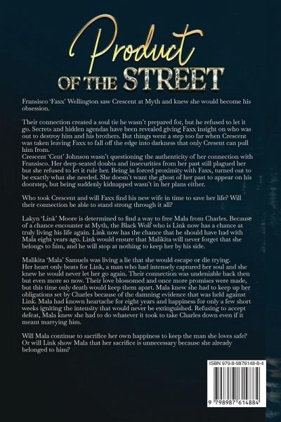Fransisco 'Faxx' Wellington saw Crescent at Myth and knew she would become his obsession. Their connection created a soul tie he wasn't prepared for, but he refused to let it go. Secrets and hidden agendas have been revealed giving Faxx insight on who was out to destroy him and his brothers. But things went a step too far when Crescent was taken leaving Faxx to fall off the edge into darkness that only Cresent can pull him from. Crescent 'Cent' Johnson wasn't questioning the authenticity of her connection with Fransisco. Her deep-seated doubts and insecurities from her past still plagued her but she refused to let it rule her. Being in forced proximity with Faxx, turned out to be exactly what she needed. She doesn't want the ghost of her past to appear on his doorstep, but being suddenly kidnapped wasn't in her plans either. Who took Crescent and will Faxx find his new wife in time to save her life? Will their connection be able to stand strong through it all? Lakyn 'Link' Moore is determined to find a way to free Mala from Charles. Because of a chance encounter at Myth, the Black Wolf who is Link now has a chance at truly living his life again. Link now has the chance that he should have had with Mala eight years ago. Link would ensure that Malikita will never forget that she belongs to him, and he will stop at nothing to keep her by his side. Malikita 'Mala' Samuels was living a lie that she would escape or die trying. Her heart only beats for Link, a man who had intensely captured her soul and she knew he would never let her go again. Their connection was undeniable back then but even more so now. Their love blossomed and once more promises were made, but this time only death would keep them apart. Mala knew she had to keep up her obligations set by Charles because of the damning evidence that was held against Link. Mala had known heartache for eight years and happiness for only a few short weeks igniting the intensity that would never be extinguished. Refusing to accept defeat, Mala knew she had to do whatever it took to take Charles down even if it meant marrying him. Will Mala continue to sacrifice her own happiness to keep the man she loves safe? Or will Link show Mala that her sacrifice is unnecessary because she already belonged to him?