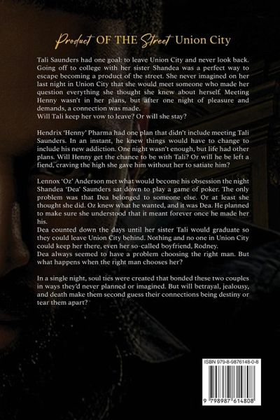 Tali Saunders had one goal: to leave Union City and never look back. Going off to college with her sister Shandea was a perfect way to escape becoming a product of the street. She never imagined on her last night in Union City that she would meet someone who made her question everything she thought she knew about herself. Meeting Henny wasn't in her plans, but after one night of pleasure and demands, a connection was made. Will Tali keep her vow to leave? Or will she stay? Hendrix 'Henny' Pharma had one plan that didn't include meeting Tali Saunders. In an instant, he knew things would have to change to include his new addiction. One night wasn't enough, but life had other plans. Will Henny get the chance to be with Tali? Or will he be left a fiend, craving the high she gave him without her to satiate him? Lennox 'Oz' Anderson met what would become his obsession the night Shandea 'Dea' Saunders sat down to play a game of poker. The only problem was that Dea belonged to someone else. Or at least she thought she did. Oz knew what he wanted, and it was Dea. He planned to make sure she understood that it meant forever once he made her his. Dea counted down the days until her sister Tali would graduate so they could leave Union City behind. Nothing and no one in Union City could keep her there, even her so-called boyfriend, Rodney. Dea always seemed to have a problem choosing the right man. But what happens when the right man chooses her? In a single night, soul ties were created that bonded these two couples in ways they'd never planned or imagined. But will betrayal, jealousy, and death make them second guess their connections being destiny or tear them apart? ***This book contains explicit language, graphic violence, and strong sexual content. It is intended for adults.***