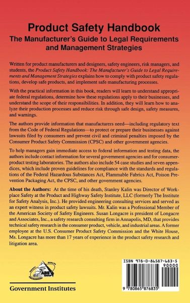 Using the detailed instructions in this book, readers will learn how to comply with product safety regulations, how to develop safe products, and how to implement safe manufacturing processes. In addition, readers will learn how to understand the federal regulations, determine how those regulations apply to their businesses, and understand the scope of their responsibilities.