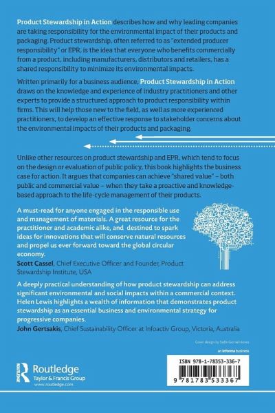 Product Stewardship in Action describes how and why leading companies are taking responsibility for the environmental impact of their products and packaging. Product stewardship, often referred to as "extended producer responsibility" or EPR, is the idea that everyone that benefits commercially from a product, including manufacturers, distributors and retailers, has a shared responsibility to minimize its environmental impacts. Written primarily for a business audience, it draws on the knowledge and experience of industry practitioners and other experts to provide a structured approach to product responsibility within firms. This will help those new to the field, as well as more experienced practitioners, to develop an effective response to stakeholder concerns about the environmental impacts of their products and packaging. Unlike other resources on product stewardship and EPR, which tend to focus on the design or evaluation of public policy, this book highlights the business case for action. It argues that companies can achieve "shared value" - both public and commercial value - when they take a proactive and knowledge-based approach to the life-cycle management of their products. Product Stewardship in Action focuses on product stewardship as an effective business strategy rather than a philanthropic exercise. To be effective it needs to be based on a good understanding of product impacts and stakeholder concerns, and the risks and opportunities that these present to the business. The most effective responses will be those that address material issues in the product life-cycle while supporting the achievement of other corporate goals and priorities.