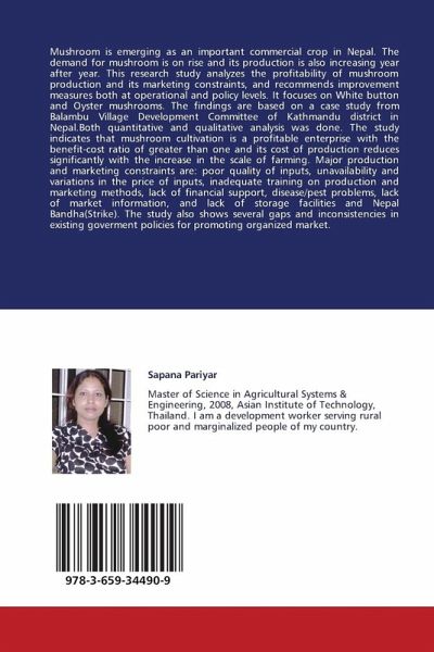 Mushroom is emerging as an important commercial crop in Nepal. The demand for mushroom is on rise and its production is also increasing year after year. This research study analyzes the profitability of mushroom production and its marketing constraints, and recommends improvement measures both at operational and policy levels. It focuses on White button and Oyster mushrooms. The findings are based on a case study from Balambu Village Development Committee of Kathmandu district in Nepal.Both quantitative and qualitative analysis was done. The study indicates that mushroom cultivation is a profitable enterprise with the benefit-cost ratio of greater than one and its cost of production reduces significantly with the increase in the scale of farming. Major production and marketing constraints are: poor quality of inputs, unavailability and variations in the price of inputs, inadequate training on production and marketing methods, lack of financial support, disease/pest problems, lack of market information, and lack of storage facilities and Nepal Bandha(Strike). The study also shows several gaps and inconsistencies in existing goverment policies for promoting organized market.