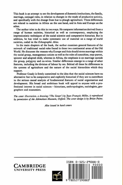 This book is an attempt to see the development of domestic institutions, the family, marriage, conjugal roles, in relation to changes in the mode of productive activity, and specifically with the change from hoe to plough agriculture. These differences are related to societies in Africa on the one hand, and in Asia and Europe on the other. The author tries to do this in two ways. He compares information derived from a range of human societies, historical as well as contemporary, employing the impressionistic techniques of the social scientist and comparative historian. But in addition, he has tried to make systematic use of material on a range of world societies, coded in the Ethnographic Atlas. In the main chapters of the book, the author examines general features of the network of traditional social roles found in these two continental areas of the Old World. He discusses the reasons why Europe and Asia should stress marriage within the social group, monogamous unions as well as the roles of concubine, step-parent, spinster and adopted child, whereas in Africa, the emphasis is on marriage outside the group, polygyny and co-wives. Similar differences emerge in a range of other features, including the division of labour by sex. Behind all these lie differences in the systems of agriculture and the nature of the social hierarchies which they support. Professor Goody is firmly committed to the idea that the social sciences have no alternative but to be comparative and explicitly historical if they are to contribute to the serious causal analysis of fundamental features of social organisation and development. His broad and ambitious book will appeal to anyone with a professional interest in social sciences - historians, anthropologists, sociologists, geographers and economists.